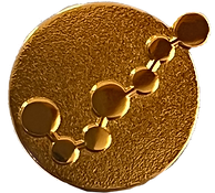 このシンボルマークは、精緻なラインで結ばれた7つの小さな球体が中央の大きな球体を囲む構成で描かれています。